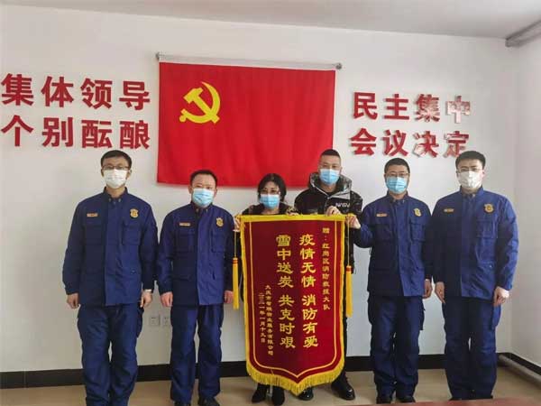 紅崗新城小區(qū)系紅崗區(qū)新冠肺炎患者密切接觸者封閉隔離小區(qū),由于天氣原因和供水設(shè)備老化導致該小區(qū)高層住宅供水中斷,500余戶居家隔離居民面臨無水可用的窘境。大慶市消防救援支隊接到求助后,第一時間啟動應(yīng)急預(yù)案,立足“內(nèi)保穩(wěn)定、外樹形象”的疫情防控指導思想,選派精干指戰(zhàn)員和2臺大噸位深入封閉隔離小區(qū)供水。指戰(zhàn)員克服了零下25度極寒天氣的不良影響,身著隔離防護服持續(xù)作業(yè)5個小時,為群眾不間斷提供生活用水60余噸,大大地緩解了市政供水設(shè)備間斷居家隔離居民用水困難的問題。