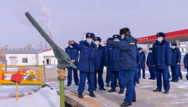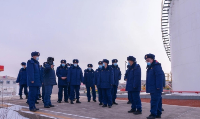 在中石油黑龍江銷售倉儲分公司黑河油庫,黑河油庫的專業(yè)技術人員帶領指戰(zhàn)員實地查看了罐區(qū)消防設施、輸油管道、泵房等重點部位及停車路線,詳細講解了各類儲罐、儲存運輸過程存在的安全隱患及泵房啟動、泡沫液供給方式。黑河油庫占地面積約36800平方米,倉儲區(qū)面積5000平方米,辦公區(qū)面積700平方米,固定資產(chǎn)5000萬元。罐區(qū)數(shù)1個,儲罐總數(shù)8個,儲罐高度12米,儲罐形式為立罐,總儲量為7500噸,儲罐結構為拱頂和內浮頂。儲存使用性質為汽油、柴油、乙醇,1號罐存儲乙醇,容積500立方米,2、3、4號罐存儲汽油,容積1000立方米,5、6、7、8號罐存儲柴油,容積1000立方米。