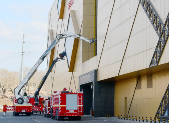 ?舉高噴射作戰(zhàn)單元到達(dá)現(xiàn)場(chǎng)后,導(dǎo)調(diào)組立即命令迅速展開實(shí)施外部控火。大型商場(chǎng)發(fā)生火災(zāi)時(shí)應(yīng)合理利用舉高消防車、車載炮、移動(dòng)水炮射水,從外部打擊火勢(shì),同時(shí)要避免因外部射流改變建筑內(nèi)部火勢(shì)、煙霧走向,威脅內(nèi)攻人員安全,在可能因飛火和強(qiáng)輻射熱引燃毗鄰建筑的重點(diǎn)部位設(shè)防。