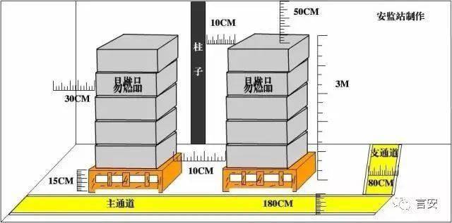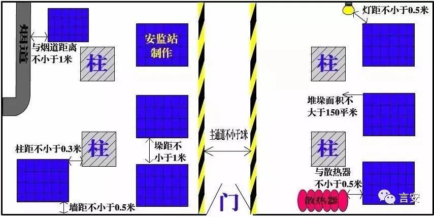 庫房主通道寬度不應(yīng)小于2米?!秱}儲場所消防安全管理通則》(GA1131-2014)6.7物品堆垛與堆垛之間的距離不小于1米?!秱}儲場所消防安全管理通則》(GA1131-2014)6.8物品與照明燈之間的距離不小于0.5米?!秱}儲場所消防安全管理通則》(GA1131-2014)6.8物品與墻之間的距離不小于0.5米?!秱}儲場所消防安全管理通則》(GA1131-2014)6.8物品堆垛與柱之間的距離不小于0.3米?!秱}儲場所消防安全管理通則》(GA1131-2014)6.8儲存物品與風(fēng)管、供暖管道、散熱器的距離不應(yīng)小于0.5米。與供暖機(jī)組、風(fēng)管爐、煙道之間的距離在各個方向上都不應(yīng)小于1米。《倉儲場所消防安全管理通則》(GA1131-2014)6.14