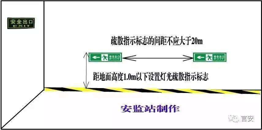 主要依據(jù):應(yīng)在疏散走道轉(zhuǎn)彎和交叉部位兩側(cè)的墻面、柱面距地面高度1.0m以下設(shè)置燈光疏散指示標(biāo)志;確有困難時,可設(shè)置在疏散走道上方2.2m~3.0m處;疏散指示標(biāo)志的間距不應(yīng)大于20m?!度藛T密集場所消防安全管理》(GA654-2006)8.3.4.1