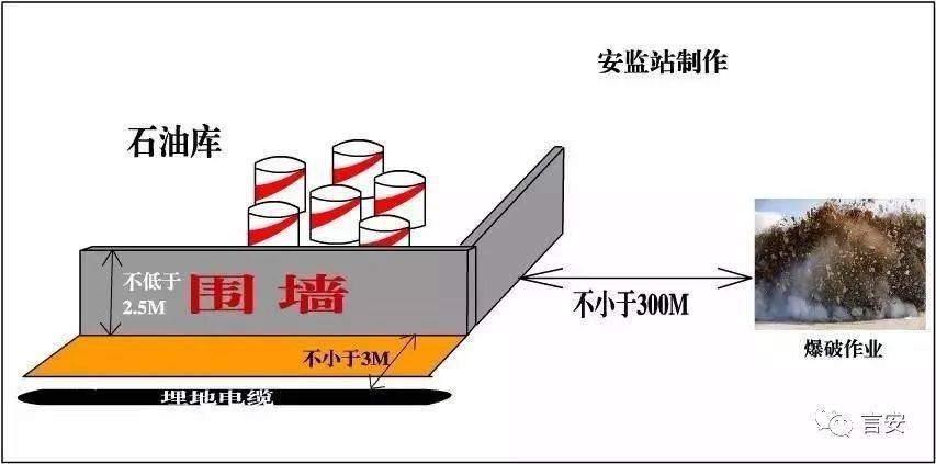 主要依據(jù):油庫四周應(yīng)設(shè)高度不低于2. 5m的實體圍墻。《石油庫設(shè)計規(guī)范》(GB50074-2014)5.3.3 油庫的圍墻與爆破作業(yè)場地(如采石場)的安全距離,不應(yīng)小于300m。《石油庫設(shè)計規(guī)范》(GB50074-2014)4.0.12 石油庫用的庫外埋地電纜與石油庫圍墻的距離不應(yīng)小于3m。《石油庫設(shè)計規(guī)范》(GB50074-2014)4.0.13