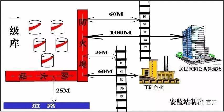 主要依據(jù):甲B、乙類液體:地上罐組;甲B,乙類覆土立式油罐;無油氣回收設(shè)施的甲B、乙A類液體裝卸碼頭(一級庫):距離居民區(qū)和公共建筑物100米,距離工礦企業(yè)60米,距離國家鐵路線60米,距離工業(yè)企業(yè)鐵路線35米,距離道路25米。