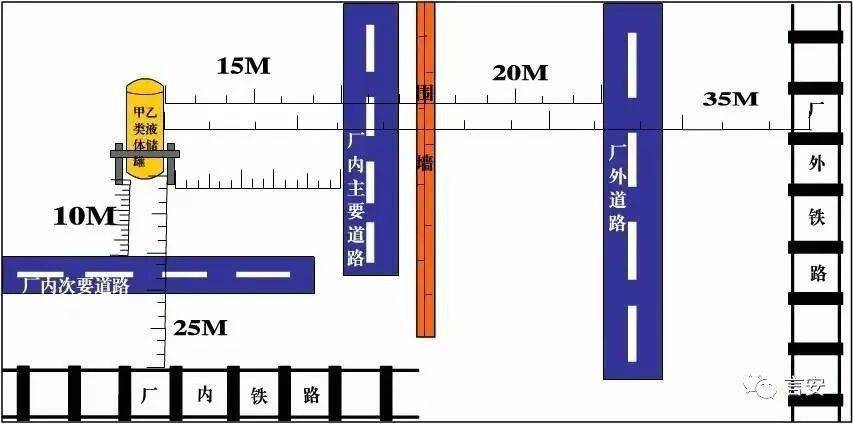 主要依據(jù):甲、乙類液體儲罐與廠外鐵路中心線、廠內(nèi)鐵路中心線、廠外道路路邊、廠內(nèi)主要道路路邊和廠內(nèi)次要道路路邊的防火間距不應(yīng)小于35、25、20、15和10米?!督ㄖO(shè)計防火規(guī)范》(GB50016-2014)4.2.9