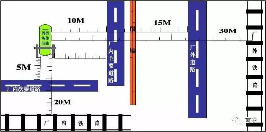 主要依據(jù):丙類液體儲罐與廠外鐵路中心線、廠內(nèi)鐵路中心線、廠外道路路邊、廠內(nèi)主要道路路邊和廠內(nèi)次要道路路邊的防火間距不應(yīng)小于30、20、15、10和5米?!督ㄖO(shè)計防火規(guī)范》(GB50016-2014)4.2.9