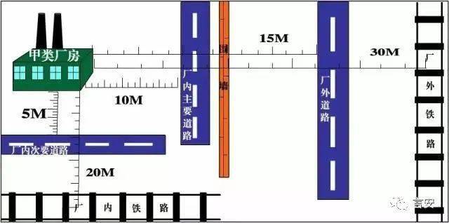 主要依據(jù):散發(fā)可燃?xì)怏w、可燃蒸氣的甲類廠房與廠外鐵路中心線、廠內(nèi)鐵路中心線、廠外道路路邊、廠內(nèi)主要道路路邊和廠內(nèi)次要道路路邊的防火間距不應(yīng)小于30、20、15、10和5米?!督ㄖO(shè)計防火規(guī)范》(GB50016-2014)3.4.3