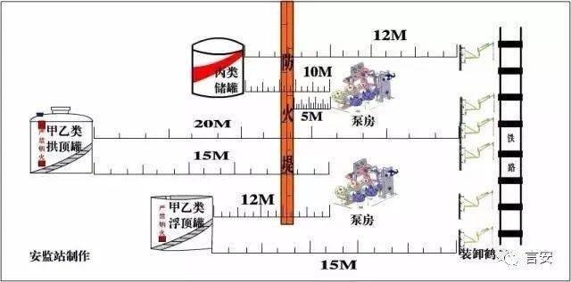 主要依據(jù):甲乙拱頂罐與其泵房、鐵路及裝卸鶴管的防火間距為15米和20米;甲乙浮頂罐與其泵房、鐵路及裝卸鶴管的防火間距為12米和15米;丙類液體儲罐與其泵房、鐵路及裝卸鶴管的防火間距為10米和12米。泵房和裝卸鶴管與儲罐防火堤外側(cè)基腳線的距離不應(yīng)小于5米?!督ㄖO(shè)計防火規(guī)范》(GB50016-2014)4.2.7