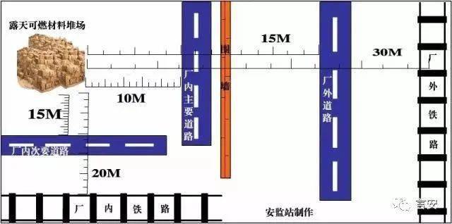 主要依據(jù):露天、半露天可燃材料堆場與廠外鐵路中心線、廠內(nèi)鐵路中心線、廠外道路路邊、廠內(nèi)主要道路路邊和廠內(nèi)次要道路路邊的防火間距不應(yīng)小于30、20、15、10和5米?!督ㄖO(shè)計防火規(guī)范》(GB50016-2014)4.5.3
