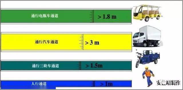 主要依據(jù):通行汽車,寬度>3 m;通行電瓶車,寬度>1.8 m;通行手推車、三輪車,寬度>1.5 m;一般人行通道,寬度>1 m。未查到相關(guān)標(biāo)準(zhǔn),但在注安考試教材中有明確說明。